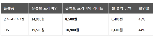 | 유튜브 프리미엄 | 14,900원 | 라이트 기능 + 유튜브 뮤직 |