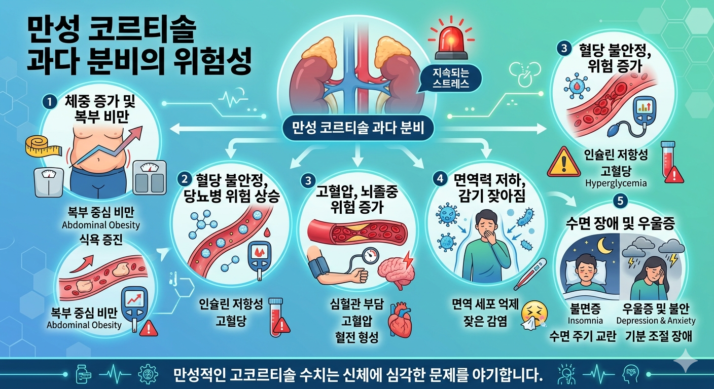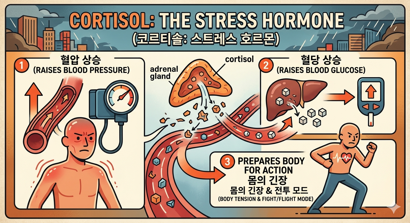 우리 몸의 스트레스 호르몬인 코르티솔(cortisol)은 부신피질에서 분비되며, 스트레스 상황에서 혈압과 혈당을 높이고 몸이 긴장하도록 만드는 역할을 합니다. 일시적으로는 유익하지만 만성적으로 높은 수준이 지속되면 혈압 상승, 면역 기능 저하, 심혈관 질환 위험 증가로 이어집니다.