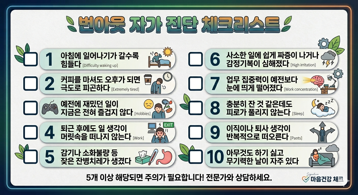 아래 항목 중 **5개 이상** 해당된다면 번아웃을 의심해 볼 필요가 있습니다.