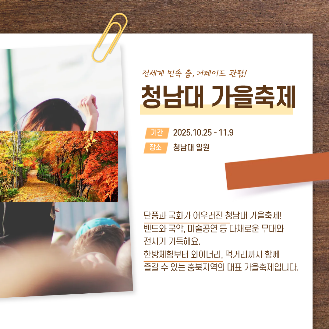 지금 달력을 펼치고, 가장 끌리는 축제 한 곳을 선택해 특별한 가을날의 추억을 만들어보세요! 🍂