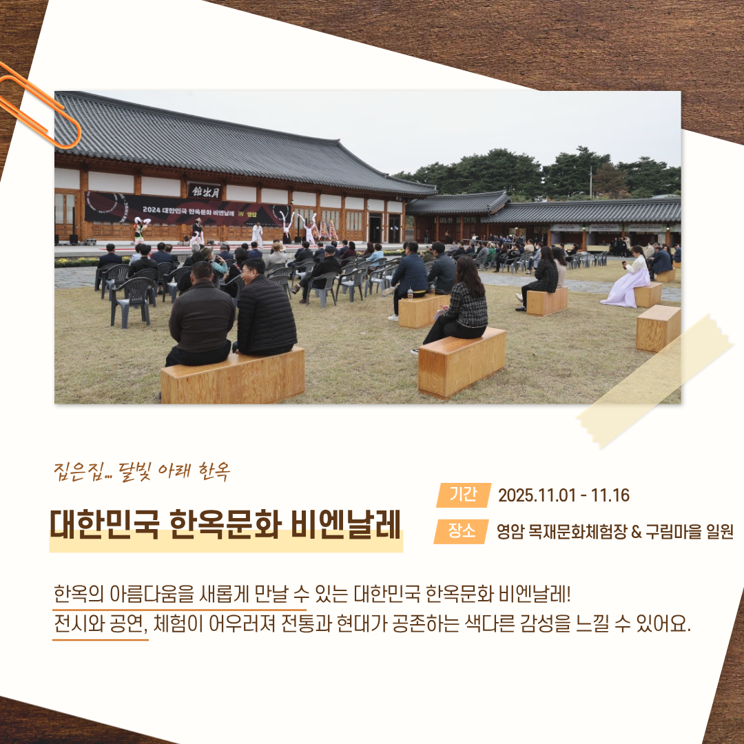 대한민국 한옥문화 비엔날레는 영암 목재문화체험장과 구림마을 두 곳에서 진행되니, 동선을 미리 짜두세요!