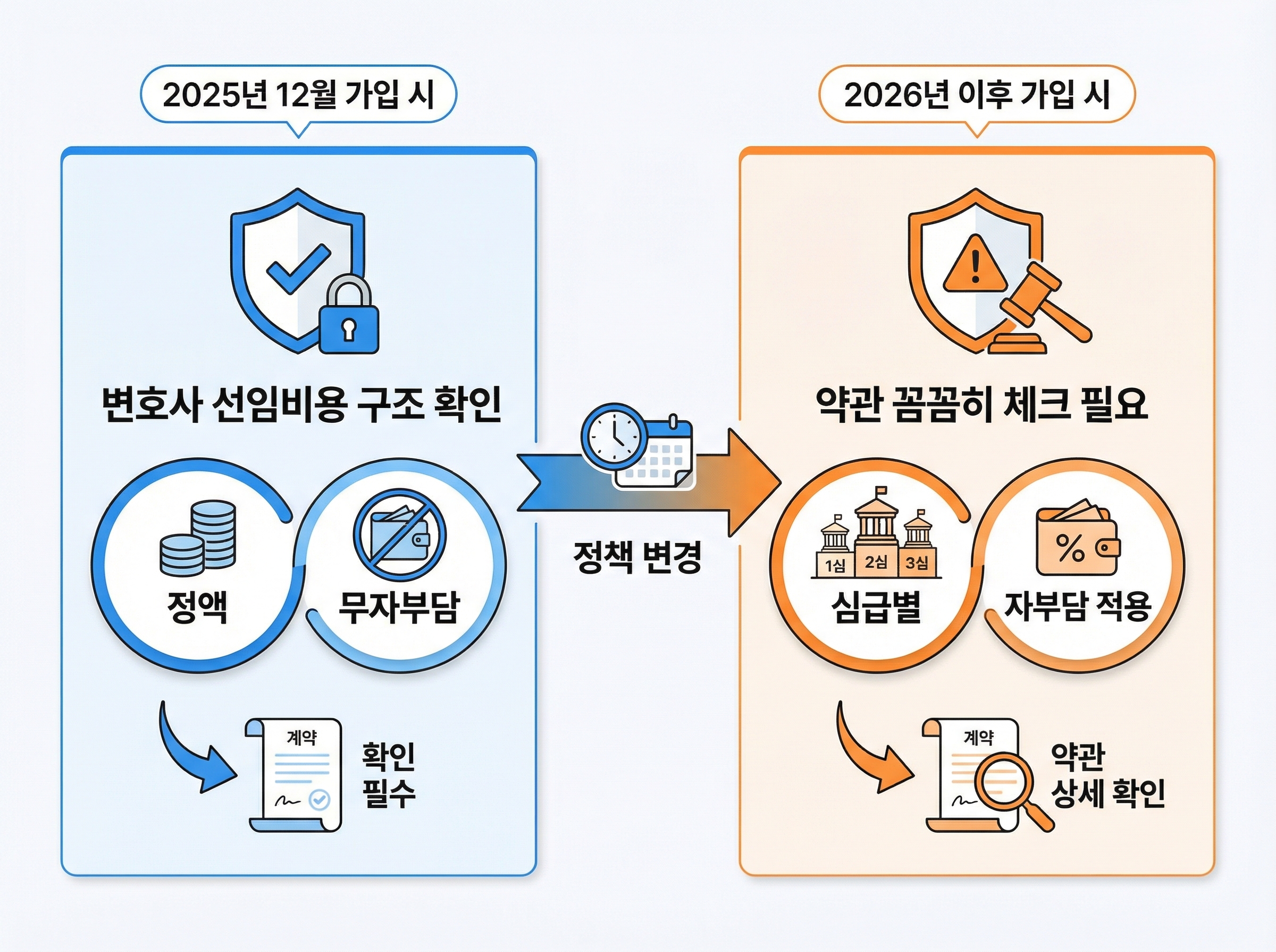 | 변호사 선임비용 한도 | 심급 구분 없이 최대 5,000만 원 정액 보장 | 1심/2심/3심 각각 한도 (예:1심 500만 원) |
