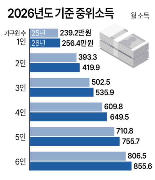 기준 중위소득이 2026년 역대 최대 폭으로 인상되어 4인 가구 기준 649만 원으로 확정되었습니다.