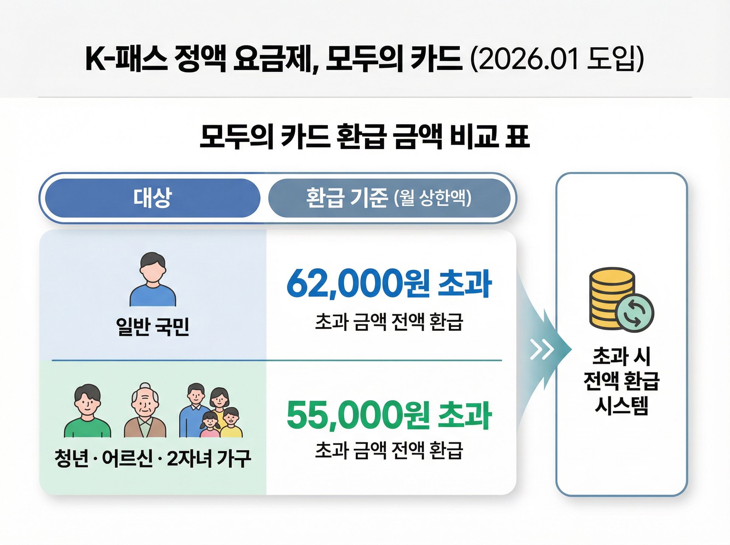 2026년 1월부터 K-패스에도 정액 요금제, '모두의 카드'가 도입됩니다. 수도권 기준 일반 국민은 월 6만 2,000원,