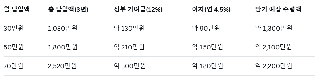 매달 최대로 납입하면 정부 기여금과 이자를 더해 만기 시 2,000만원 이상의 목돈을 마련할 수 있습니다.