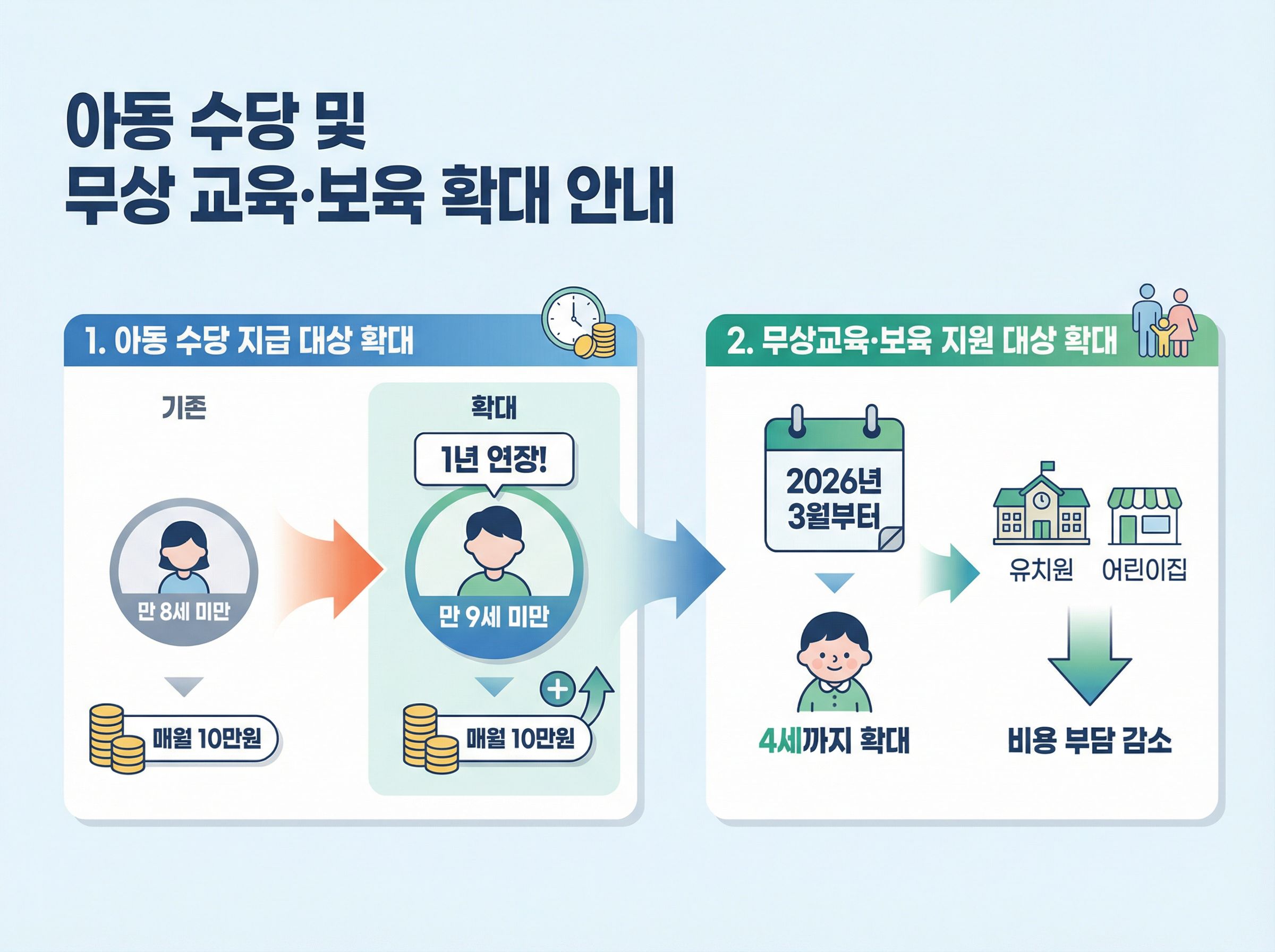 2026년 3월부터는 무상교육·보육 지원 대상이 4세까지 확대되어 유치원이나 어린이집 비용 부담이 줄어듭니다.