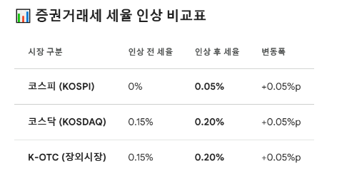 코스피는 0%에서 0.05%로, 코스닥과 K-OTC는 0.15%에서 0.20%로 인상됩니다. 단타 매매가 잦은 투자자라면 늘어나는 거래 비용을 유의해야 합니다.